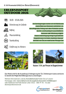 Vom 30.05 - 05.06.2026 findet unser C-50 Flexmodul „Erlebnissport Outdoor“ im Ötztal in Österreich statt. Inhalte des Lehrgangs werden unter anderem sein: Orientierung im Gelände, Rafting, Teambuilding und eine Einführung ins Klettern und Moutainbiking.