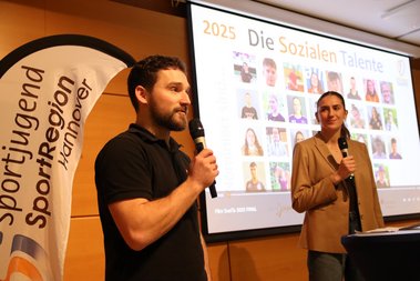 Durch den Abend führte auf sehr angenehme Art wie schon im vergangenen Jahr Nico Schlehuber (Vorstand Hannoversche Sportjugend). Ihm zur Seite stand Marie Ellen Becker (Soziales Talent 2024 und aktuell FWDlerin der Sportjugend im Regionssportbund), die die Nominierten in Manier einer Fieldreporterin charmant zu Wort bat.