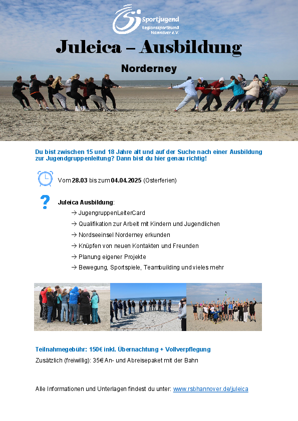Die Angebote für die JULEICA-Ausbildung findest Du hier auf dieses Seite oder über das BildungSportal des LandesSportBundes Niedersachsen.