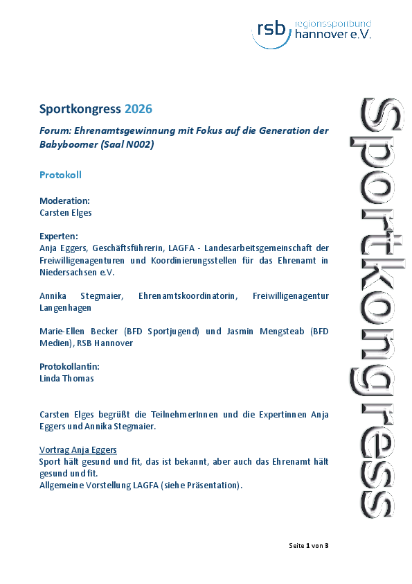 Der Sportkongress ist eine Informationsveranstaltung und Kommunikationsplattform für Vereinsvertreter:innen aus Stadt und Region Hannover. Den Besuchenden soll die Möglichkeit geboten werden, sich in einem von drei Foren über sportpolitische Fragen zu informieren, sich Anregungen zu holen und untereinandner auszutauschen.