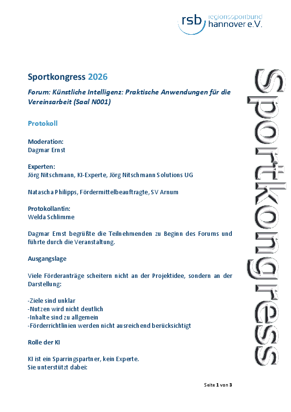 Gleichzeitig wurde deutlich: KI ersetzt keine Verantwortung. Die Ergebnisse basieren auf Wahrscheinlichkeiten und müssen immer überprüft werden. Vereinsverantwortliche bleiben letztlich für die Inhalte verantwortlich, die sie veröffentlichen oder weitergeben.