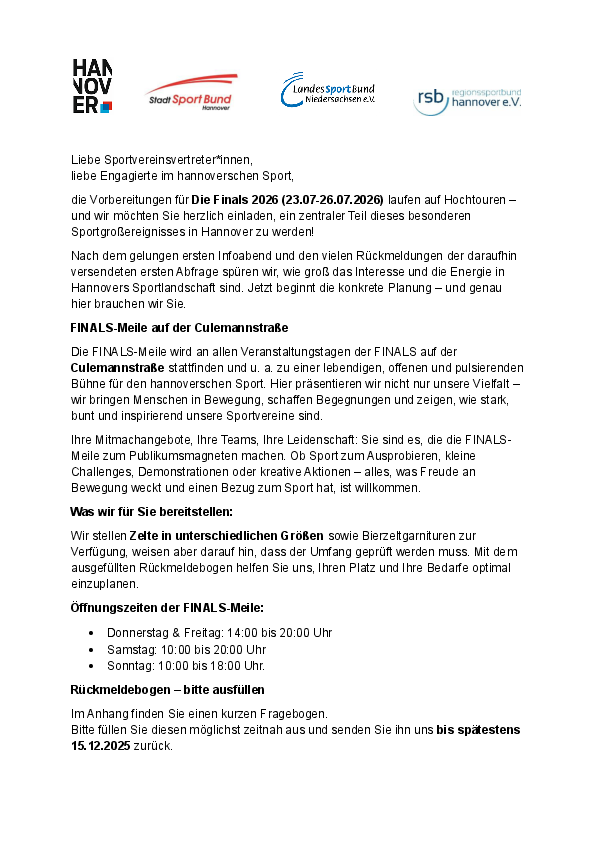 Nach einem erfolgreichen Infoabend und zahlreichen Rückmeldungen beginnt nun die konkrete Planung der FINALS-Meile. Die Stadt Hannover hat am 27.11. alle Sportvereine in der SportRegion Hannover eingeladen, sich aktiv als Teil der FINALS-Meile auf der Culemannstraße einzubringen.
